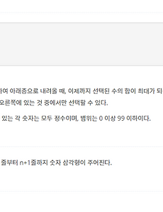 Project/Algorithm31 [TopCoder] 탑코더를 시작하며 이번에 "탑코더 알고리즘 트레이닝" 책을 구입하여 이 책을 2~3주 간 모두 풀어볼 예정입니다.기초부터 잘 작성이 되어 있는 것 같고 알고리즘을 처음 시작하는 사람들에게는 정말 좋은 책 같습니다.최근에 많은 알고리즘을 풀면서 뭔가 찝찝하게 문제를 못 풀어서 빠르게 다시 시작하자고 마음 먹었습니다. 탑코더(TopCorder) 일단 이 책은 어디에서나 구입이 가능합니다. 이 책을 통해 기본적인 알고리즘 푸는 방법을 공부해보려 합니다.또한 TopCorder 알고리즘 대회에도 참가해보려고 합니다. 많은 해외 기업에서 대회도 열고 있고 전 세계적으로 많은 프로그래머들이 대회에 참가합니다. 대충이라도 세계적으로 나의 알고리즘 실력을 가늠해볼 수 있을 것입니다.현재 책에 이러한 탑코더를 사용하는 방법까지 기재를 해놨.. 2017. 10. 24. [백준 알고리즘] 2597번(계단 오르기) - DP 문제 백준 알고리즘 DP 문제를 마스터하기 위해 오늘도 DP 문제를 풉니다.이 계단 오르기 문제는 제약사항이 있습니다. 아래에 문제를 보시면 아시겠지만 제약 조건이 있기 때문에 그 조건에 맞춰서마지막부터 고려하여 식을 작성하면 될 것 같습니다. 문제 해석 일단 문제를 이해하시는데 큰 어려움은 없을 것이고, 조건이 무엇인지 보겠습니다.1. 한 번에 1계단 또는 2계단 오를수 있다.2. 연속된 3계단을 오르지 못한다.3. 마지막 도착 계단은 반드시 밟아야 한다. 다음은 예제 입력을 배열로 나타낸 것입니다 여기서 list[1] > list[2] > list[3] 이렇게 연속해서 밟으면 안되며 마지막 list[6]은 무조건 밟아야 합니다. 맨 뒤에 list[6]을 밟아야 하니 마지막부터 보겠습니다.도착점을 밟을 수 .. 2017. 9. 11. [백준 알고리즘] 1932번(숫자 삼각형) - DP 문제 백준 알고리즘 요즘에 많은 기업에서 알고리즘 시험을 보는 것 같습니다.카카오도 그렇고 다른 기업들도 S/W 분야는 인적성 대신 알고리즘 시험을 치는 것 같습니다.그래서 오늘도 꾸준히 문제를 풀어보도록 하겠습니다.전과 같은 DP 문제 입니다. 문제 해설 문제는 쉽게 이해를 하실 수 있을 겁니다. 제일 위에서 부터 제일 아래까지 내려가면서 자기 자식을 더해서 가장 큰 값을 구하는 문제입니다. i 가 1 ->3으로 갈 때까지 최고 합을 구하면 되는 것입니다.경우의 수를 보게 되면 ABD / ABE / ACE / ACF 이렇게 4가지가 있습니다.ABF가 안되는 이유는 당연히 문제에 대각선 왼/오른쪽(자식) 중 선택하라고 했으므로F는 C의 자식이지 B의 자식이 아니기 때문에 당연히 안됩니다. 간략하게 배열에 맞게.. 2017. 9. 9. [백준 알고리즘] 1149번(RGB거리) - 관련 : DP문제 백준 알고리즘 오늘 풀어본 문제는 다이나믹 프로그래밍과 관련된 문제입니다.알고리즘이 아직 생소해서 그런지 문제를 이해하는데 시간이 걸렸습니다.특히 오늘은 어이없는 실수를 했습니다. 어떤 실수를 했는지는 밑에 있습니다.참 부끄럽네요 이런 실수는.... 동적 계획법(Dynamic Programming)혹시나 아직 개념을 모르시는 분이 있을까봐 설명을 드립니다.일반적으로 문제를 여러 개의 하위 문제로 나누어 푼 다음, 그것을 결합하여 최종적인 목적에 도달하는 것입니다.각 하위 문제의 해결을 계산하고 그 계산 값을 다른 곳에 저장해 두었다가 같은 문제가 나왔을 경우 저장된 값을 가지고와서 불필요한 것들을 줄이고 계산을 빨리 할 수 있도록 도와줍니다.더 자세한 내용은 이 곳에서 확인 하세요(출처 : 위키 백과) .. 2017. 9. 5. [백준 알고리즘] 2407번(조합) [백준 알고리즘] 지난 번에 팩토리얼에 대해 풀었고 이번에는 조합에 대한 문제입니다. 조합에 대한 문제는 예전에 제가 이항계수 때 풀어놓은 것이 있어서그것을 이용하여 문제를 해결했습니다.이번에 조금 다른 것이 있다면 범위 입니다. 조합 조합에 대해 모르는 사람은 없을 것이라고 생각하지만혹시나 조합에 대해 모르는 사람이 있을 수도 있다고 생각하기에간단한 설명을 드리겠습니다.조합은 영어로 Combination이라고 하며 기본적인 원리는 이렇습니다.n개에서 r개를 고를 수 있는 경우의 수입니다.(중복 X)예를 들어 보겠습니다.A / B / C / D / E 라는 사람 중에 2명 씩 짝을 이룰수 있는 경우를 구해보겠습니다.AB / AC / AD / AE / BC / BD / BE / CD / CE / DE 이렇.. 2017. 9. 1. 이전 1 2 3 4 5 ··· 7 다음